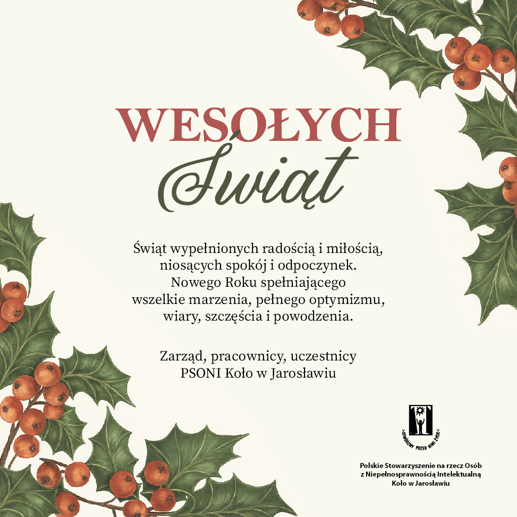 Z okazji zbliżających się Świąt Bożego Narodzenia w imieniu całego zespołu PSONI Koło w Jarosławiu składamy serdeczne życzenia zdrowia, spokoju, miłości oraz nadziei na lepsze jutro.