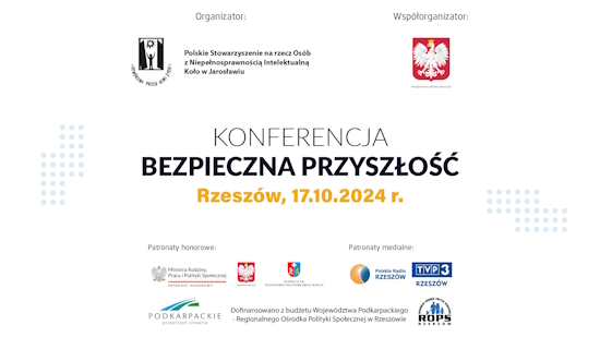17 października 2024r. odbyła się konferencja pn. „Bezpieczna przyszłość”, w której udział wzięło 150 osób - przedstawiciele ŚDS, MOPS, GOPS, przedstawiciele samorządu terytorialnego oraz organizacji pozarządowych działających w obszarze pomocy społecznej w szczególności na rzecz osób z niepełnosprawnością intelektualną z terenu województwa podkarpackiego.